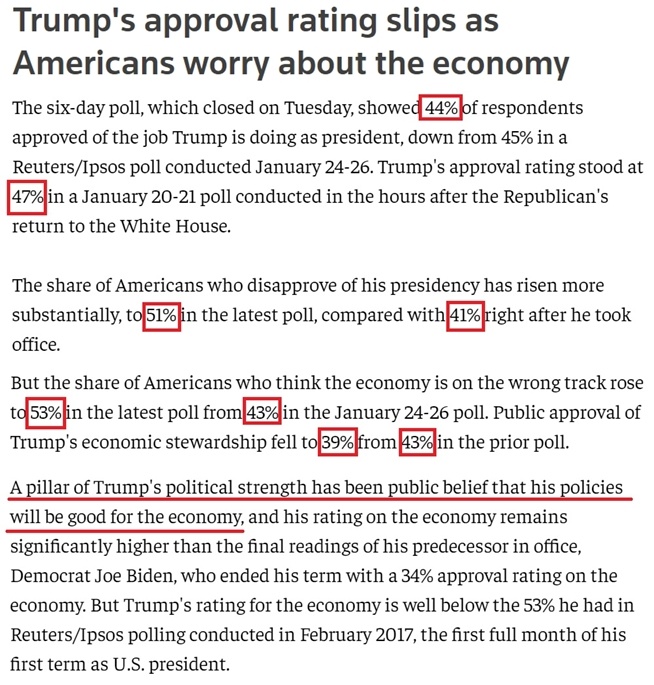 路透社在報(bào)道中指出,特朗普政治實(shí)力的一個支柱就是不少人相信他的政策對經(jīng)濟(jì)有利,而最新民調(diào)結(jié)果顯示,越來越多的美國人因?yàn)檫@位新總統(tǒng)威脅要對外加征關(guān)稅而對美國的經(jīng)濟(jì)發(fā)展方向感到擔(dān)憂。