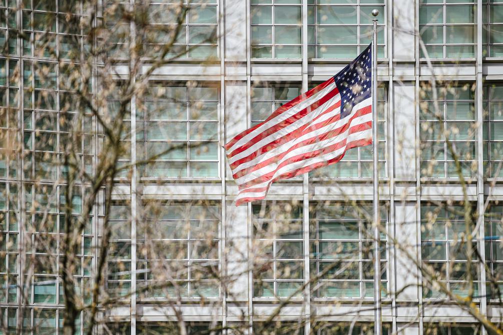 這是2021年4月16日在俄羅斯首都莫斯科拍攝的美國(guó)駐俄羅斯大使館。新華社發(fā)(葉甫蓋尼·西尼岑攝)