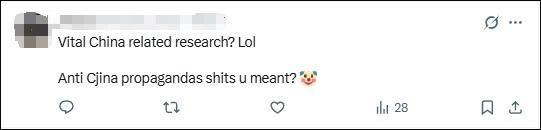 在該所X平臺(tái)賬號(hào)轉(zhuǎn)發(fā)《華爾街日?qǐng)?bào)》報(bào)道的評(píng)論區(qū),有人說(shuō):“重要的中國(guó)相關(guān)研究?哈哈哈,你說(shuō)的是反華宣傳吧。”