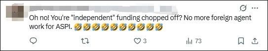 “哦豁!‘獨(dú)立智庫(kù)’的資金被切斷啦?ASPI這下做不成外國(guó)代理人的勾當(dāng)咯?!?/p>