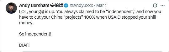 “笑死,你們?nèi)嗽O(shè)崩了。”在中國(guó)生活和工作多年的新西蘭媒體人安迪·博勒姆(中文名安柏然)也嘲諷道,“成天標(biāo)榜自己‘獨(dú)立’,現(xiàn)在美國(guó)國(guó)際開發(fā)署斷了黑錢,對(duì)華‘項(xiàng)目’得100%砍光。還真是獨(dú)立啊!趕緊涼透吧!”