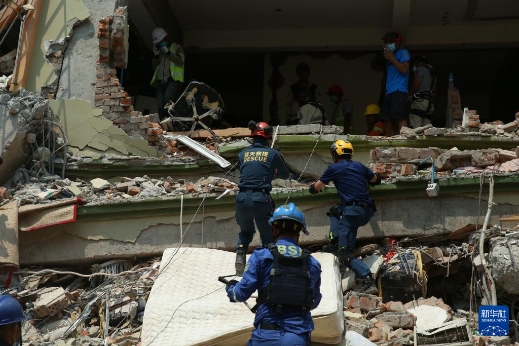 3月30日,在緬甸曼德勒天空別墅公寓建筑群,救援隊(duì)及志愿者一起開(kāi)展救援活動(dòng)。新華社發(fā)(苗覺(jué)梭攝)