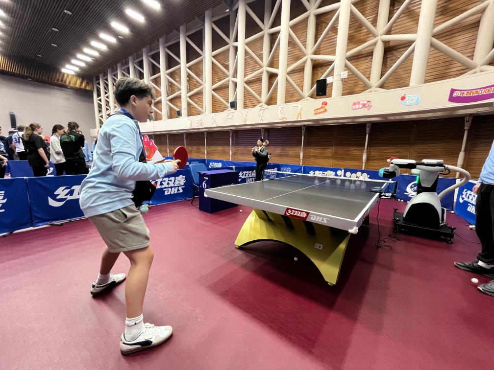 二樓體驗(yàn)區(qū)的乒乓球發(fā)球機(jī)器人前,學(xué)生們輪番挑戰(zhàn)。曾在美國全國U14乒乓球比賽中拿下過第7名的瑞恩·特洛伊·李揮拍上陣,飛快的反應(yīng)速度引發(fā)伙伴們此起彼伏的歡呼和掌聲。