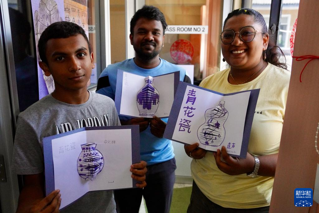 在學(xué)習(xí)制作青花瓷賀卡的課堂上,21歲的阿基拉·恰米卡拉一邊描畫青花瓷瓶身的弧線,一邊將斯里蘭卡大象與中國傳統(tǒng)紋樣填入其中,沿著畫紙細(xì)細(xì)裁剪幾道,便制成一張立體賀卡?!拔液芟矚g中國文化,我想在作品中將中國文化與斯里蘭卡本土文化相融合?!彼f。
