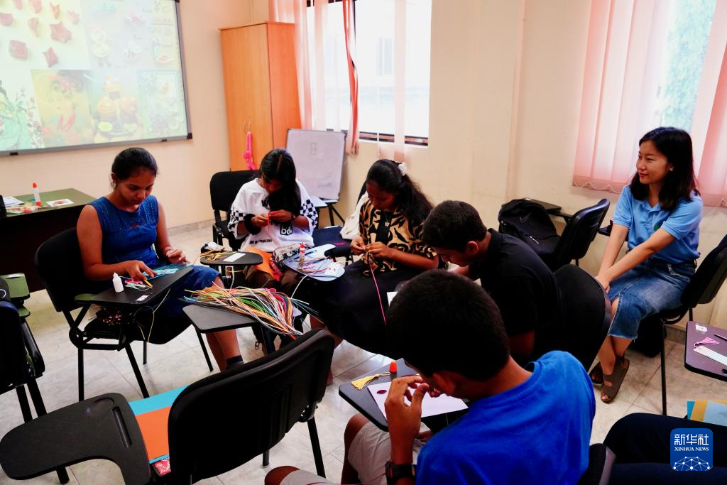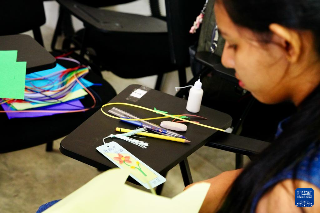 4月19日,在斯里蘭卡首都科倫坡舉行的聯(lián)合國中文日活動上,蘭比尼孔子課堂的學(xué)生學(xué)習(xí)制作衍紙書簽。新華社記者 伍岳 攝
