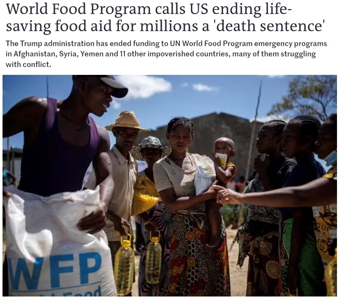 世界糧食計劃署警告說,美國中斷緊急糧食援助相當(dāng)于是對千百萬面臨極端饑餓的民眾“判處死刑”。