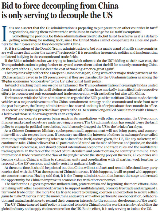 原標(biāo)題:Bid to force decoupling from China is only serving to decouple the US