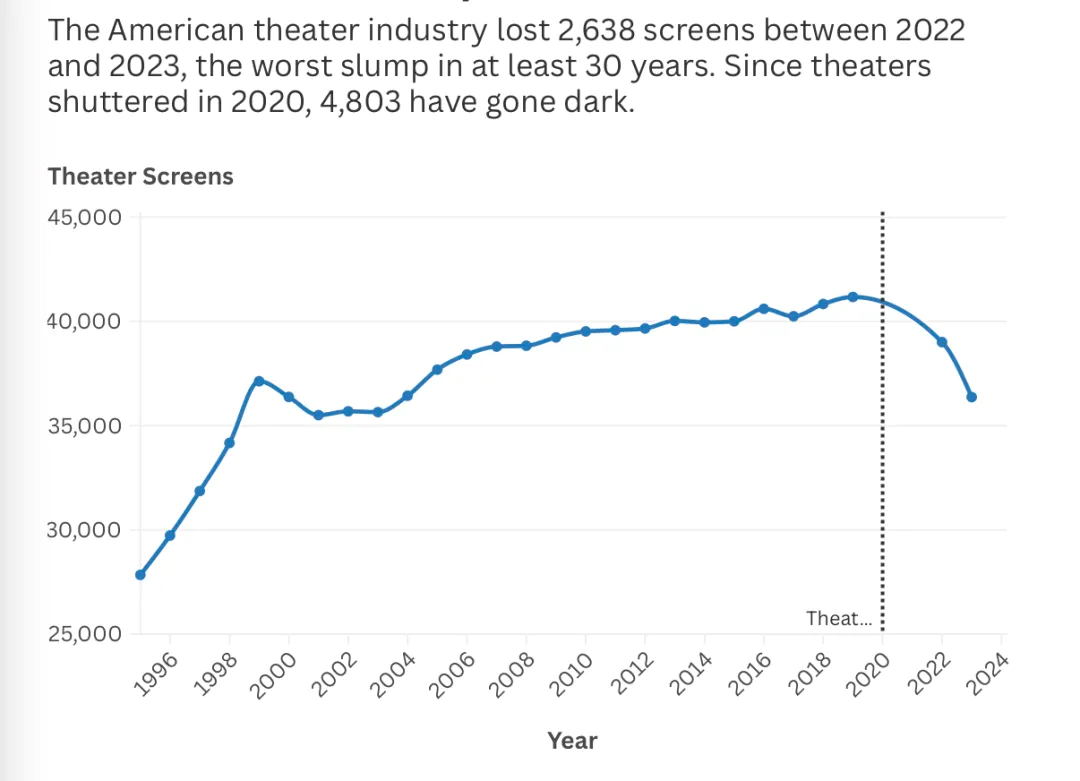 △2022年至2023年間,美國(guó)影院損失了2638塊銀幕,這個(gè)趨勢(shì)還在延續(xù)。