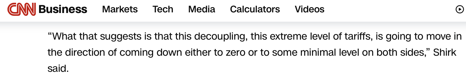 美國(guó)有線電視新聞網(wǎng)的報(bào)道注意到美國(guó)財(cái)政部長(zhǎng)貝森特此前關(guān)于“本周末的談判將側(cè)重于緩和緊張局勢(shì)”的表態(tài)。報(bào)道援引加州大學(xué)圣迭戈分校全球政策與戰(zhàn)略學(xué)院研究教授、21世紀(jì)中國(guó)研究中心名譽(yù)主任蘇珊·希爾克的觀點(diǎn)指出,這表明美中之間“脫鉤、極端的關(guān)稅水平,將朝著降至零,或是降至最低水平的方向發(fā)展”。