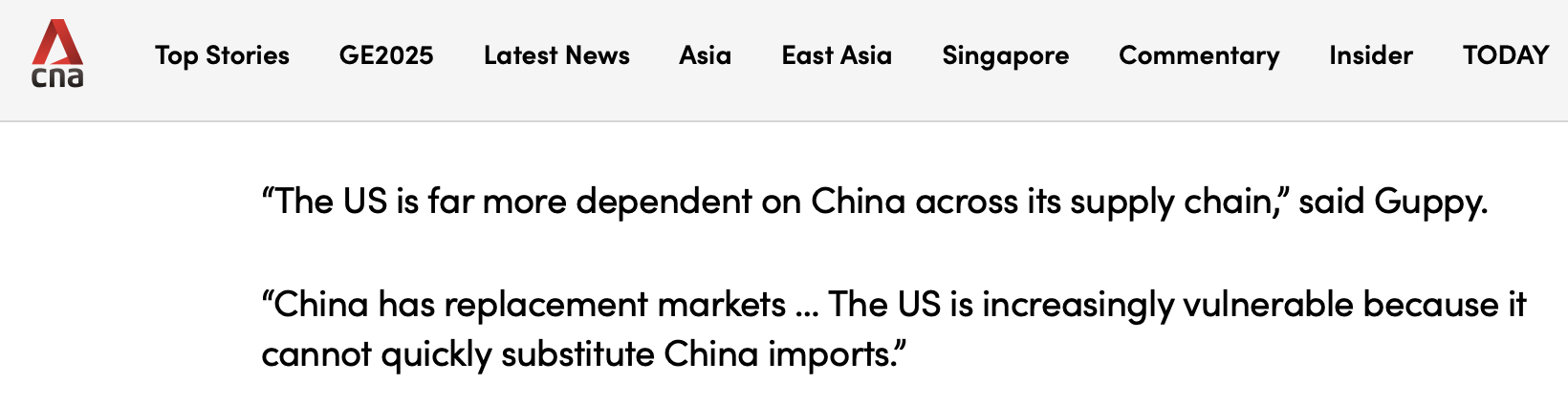 新加坡亞洲新聞臺(tái)的報(bào)道指出,中國(guó)在與美國(guó)的貿(mào)易談判中占據(jù)上風(fēng)。報(bào)道援引分析人士的觀點(diǎn)稱(chēng),中國(guó)已轉(zhuǎn)向減少對(duì)美國(guó)市場(chǎng)的依賴(lài),與全球南方國(guó)家建立更深層次的聯(lián)系,并通過(guò)共建“一帶一路”倡議投資基礎(chǔ)設(shè)施。