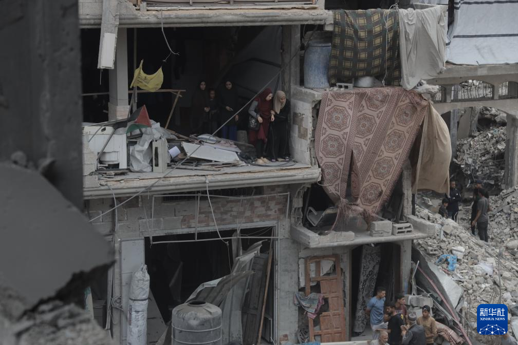 5月15日,在加沙地帶北部杰巴利耶難民營,巴勒斯坦人查看以軍轟炸后的建筑廢墟。新華社發(fā)(阿卜杜勒·拉赫曼·薩拉馬攝)