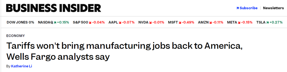 富國銀行最新報(bào)告明確指出,美國的高額關(guān)稅政策難以實(shí)現(xiàn)制造業(yè)就業(yè)的持久反彈。