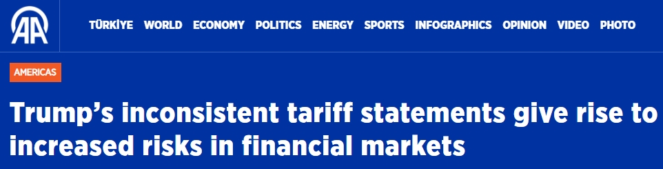 土耳其阿納多盧通訊社(Anadolu Ajans )27日的報(bào)道指出,美國(guó)政府在關(guān)稅問(wèn)題上前后不一的言論和難以預(yù)測(cè)的行動(dòng),導(dǎo)致全球金融市場(chǎng)風(fēng)險(xiǎn)加大、波動(dòng)加劇,包括最近針對(duì)歐盟所作的決定。