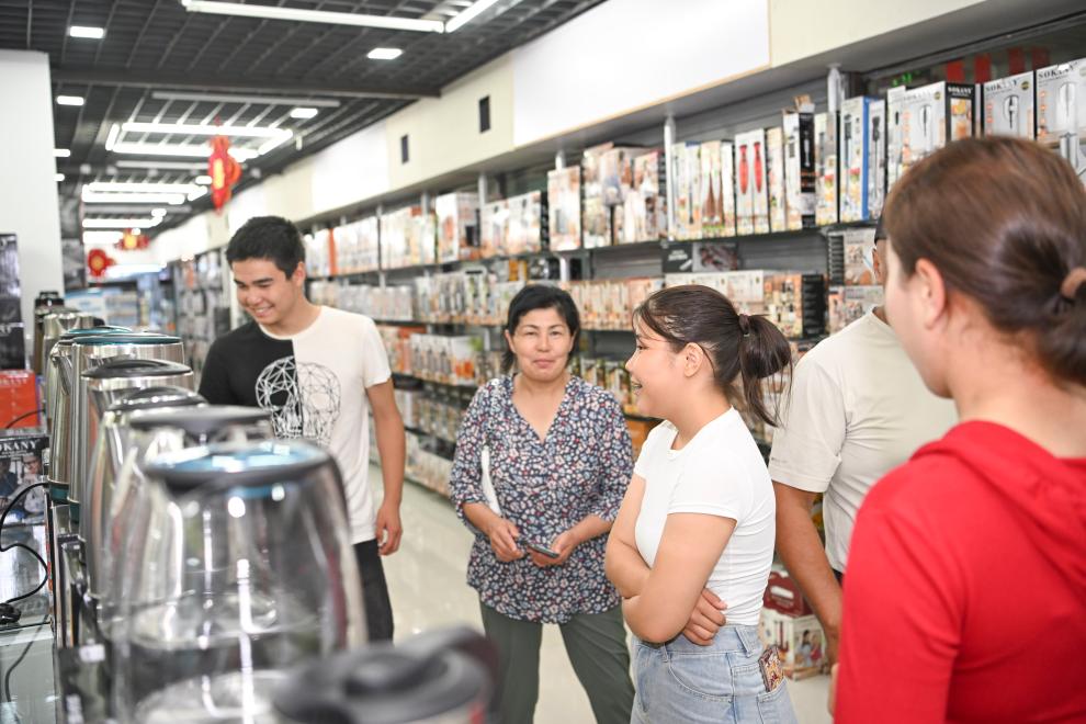 前來合作中心購(gòu)物的哈薩克斯坦顧客和巴爾然在一起聊天。