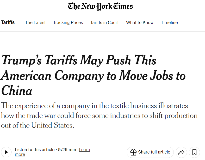 文章說,特朗普政府發(fā)起的全球貿(mào)易戰(zhàn)動(dòng)搖了Cocona Labs公司的經(jīng)濟(jì)基礎(chǔ)。受到美國關(guān)稅不確定性的影響,加之中國實(shí)施的對等反制措施,這家美國公司將開始做出改變:將其核心產(chǎn)品的部分生產(chǎn)從美國轉(zhuǎn)移到中國的工廠生產(chǎn)。