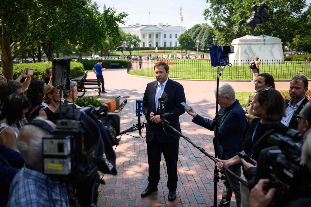8月4日,德國副總理兼財(cái)政部長克林拜爾在華盛頓會見記者。新華社/法新