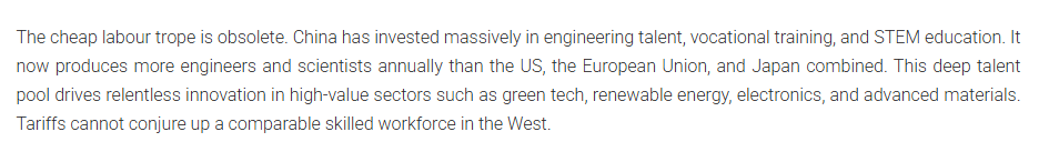 中國(guó)在工程人才、職業(yè)培訓(xùn)以及科學(xué)、技術(shù)、工程和數(shù)學(xué)教育等方面投入了大量資金?,F(xiàn)在,它每年培養(yǎng)的工程師和科學(xué)家比美國(guó)、歐盟和日本的總和還要多。這種深厚的人才庫(kù)推動(dòng)了綠色技術(shù)、可再生能源、電子和先進(jìn)材料等高價(jià)值領(lǐng)域的不懈創(chuàng)新。