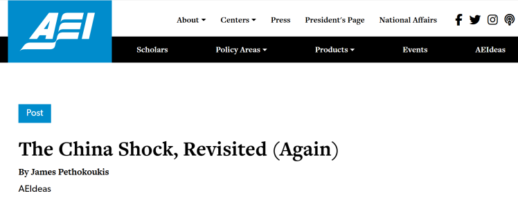當(dāng)前全球經(jīng)濟復(fù)蘇乏力、貿(mào)易保護主義抬頭,部分西方政客與媒體頻繁炒作“中國沖擊論”,企圖將損人不利己的“關(guān)稅大棒”合理化。美國知名保守派智庫美國企業(yè)公共政策研究所(American Enterprise Institute for Public Policy Research)高級研究員詹姆斯·佩索科基斯(James Pethokoukis)近日發(fā)文稱,基于大量數(shù)據(jù)分析與案例研究,“中國沖擊論”站不住腳,中國融入全球經(jīng)濟促進(jìn)了美國經(jīng)濟增長,實際上顯著提高了美國人民的生活品質(zhì)。