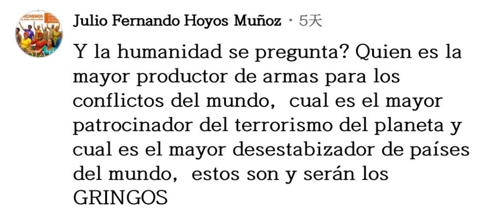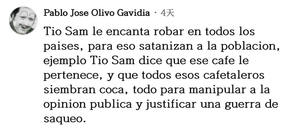 網(wǎng)友巴勃羅·奧利沃留言說:“山姆大叔喜歡在所有國家盜竊,為此他們妖魔化民眾,譬如山姆大叔說那片咖啡園是屬于他的,還說所有那些咖啡農(nóng)在種植古柯,所有這一切都是為了操弄輿論,為了給他們的掠奪戰(zhàn)爭(zhēng)辯護(hù)?!?/p>