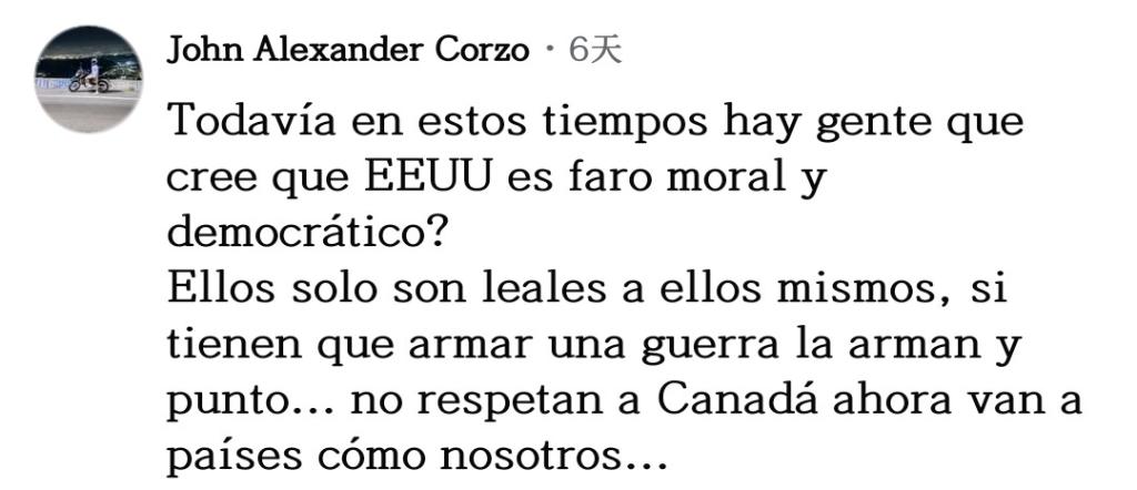 網(wǎng)友約翰·科爾索坦言道:“時(shí)至今日,還有人相信美國是道德和民主的燈塔嗎?他們只忠于自己,如果需要發(fā)動(dòng)一場(chǎng)戰(zhàn)爭(zhēng),他們隨時(shí)會(huì)發(fā)動(dòng),僅此而已!他們連加拿大都不尊重,現(xiàn)在矛頭對(duì)準(zhǔn)我們這樣的國家了。”