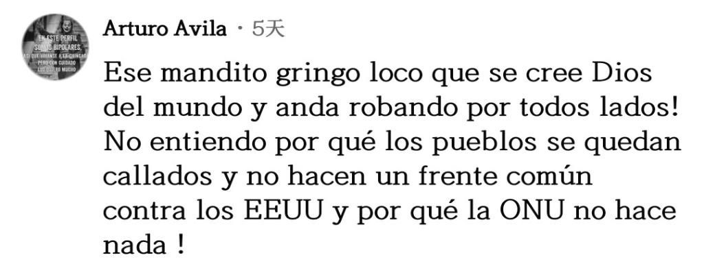 網(wǎng)友阿爾圖羅·阿維拉表達(dá)不解:“美國自以為是世界之神,到處掠奪!我不明白為什么各國人民依然保持沉默,而不是組成一個(gè)共同陣線對(duì)抗美國?!?/p>