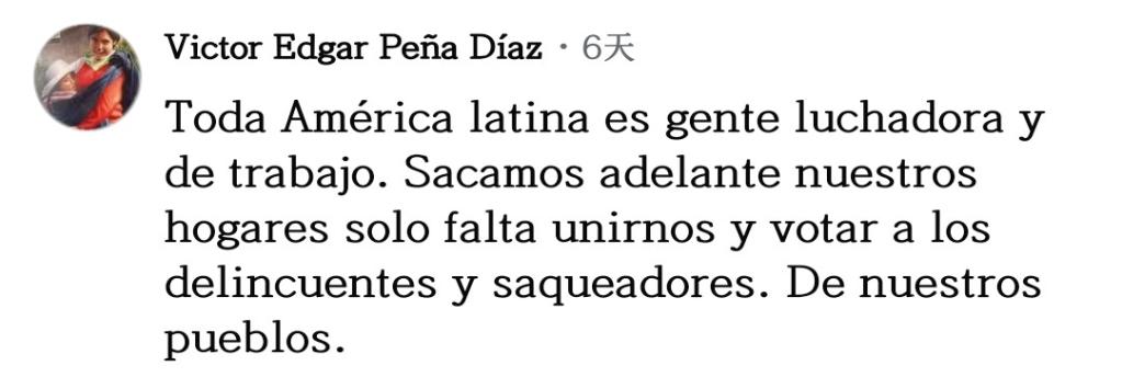 網(wǎng)友維克托·培尼亞留言說:“所有拉美人民都是勞動(dòng)者和奮斗者,我們靠自己的努力養(yǎng)家糊口?,F(xiàn)在只差團(tuán)結(jié)起來,把那些掠奪我們的罪犯和強(qiáng)盜趕跑?!?/p>