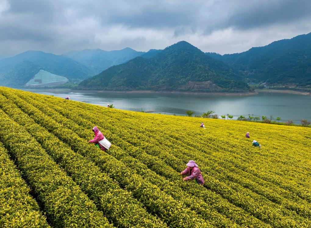 4月7日,茶農在浙江省寧波市鄞州區(qū)橫溪茶園采茶(無人機照片)。新華社發(fā)(胡學軍攝)