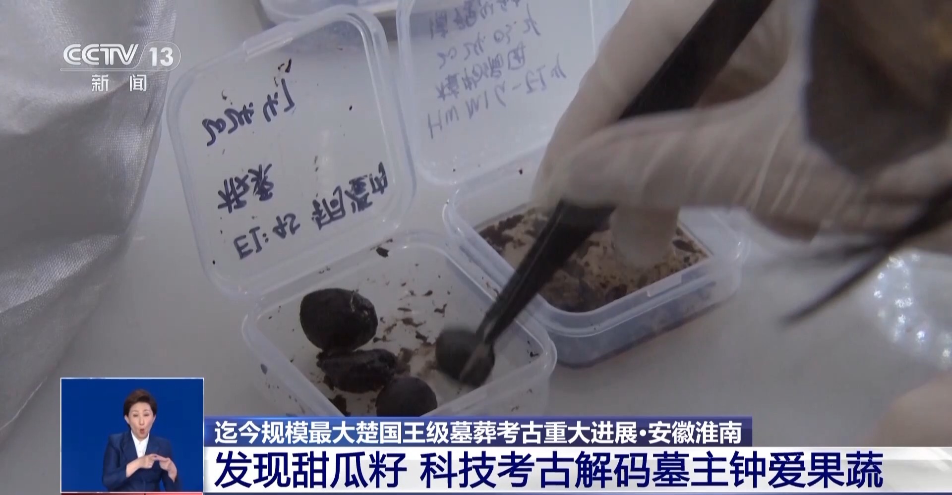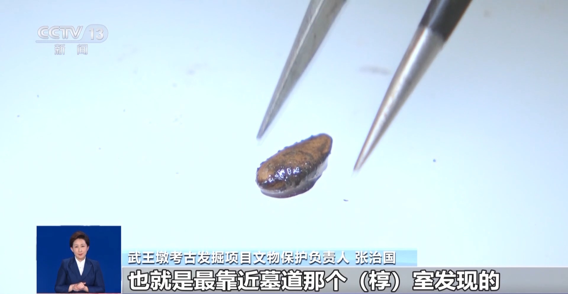 武王墩考古發(fā)掘項目文物保護負(fù)責(zé)人 張治國:發(fā)現(xiàn)大部分的這個里面都是一些樹葉,然后還有果核,可能還有一些草編的痕跡,目前初步鑒定出來的有甜瓜籽,然后還有一些梅核。