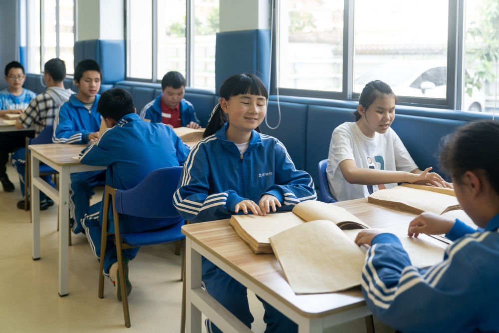 4月15日,昆明市盲啞學(xué)校的盲生們?cè)趯W(xué)校圖書(shū)室閱讀盲文書(shū)。(新華社記者 陳欣波 攝)