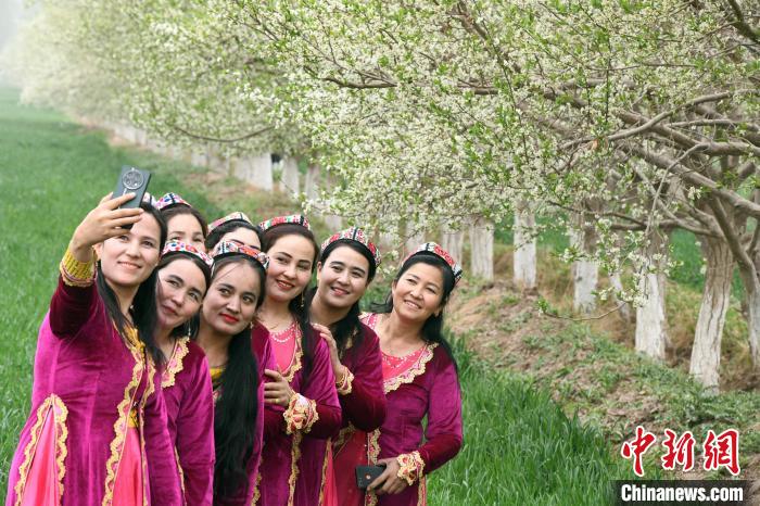 3月31日,多名游客在新疆阿克陶縣塔爾塔吉克民族鄉(xiāng)巴格艾格孜村的杏花樹下拍照。中新網(wǎng)記者孫亭文攝