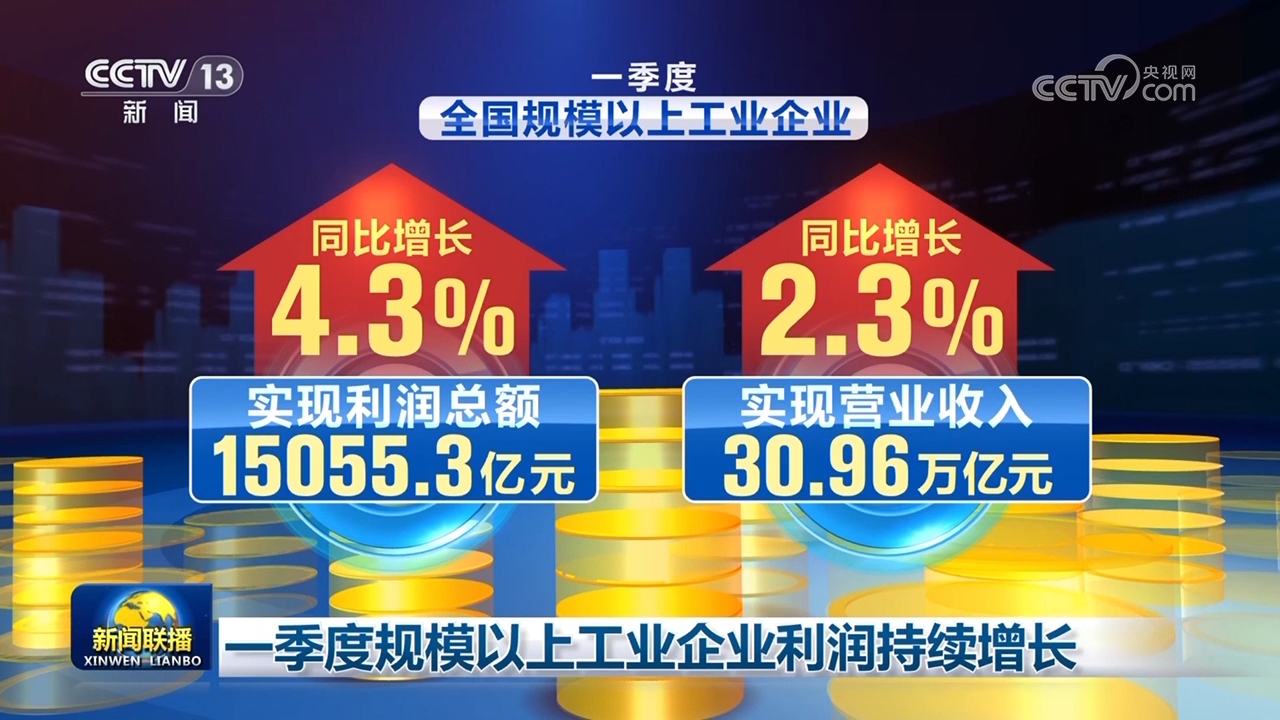一季度,全國規(guī)模以上工業(yè)企業(yè)實現(xiàn)利潤總額15055.3億元,同比增長4.3%,實現(xiàn)營業(yè)收入30.96萬億元,同比增長2.3%,工業(yè)企業(yè)利潤保持增長,工業(yè)企業(yè)營收繼續(xù)恢復。