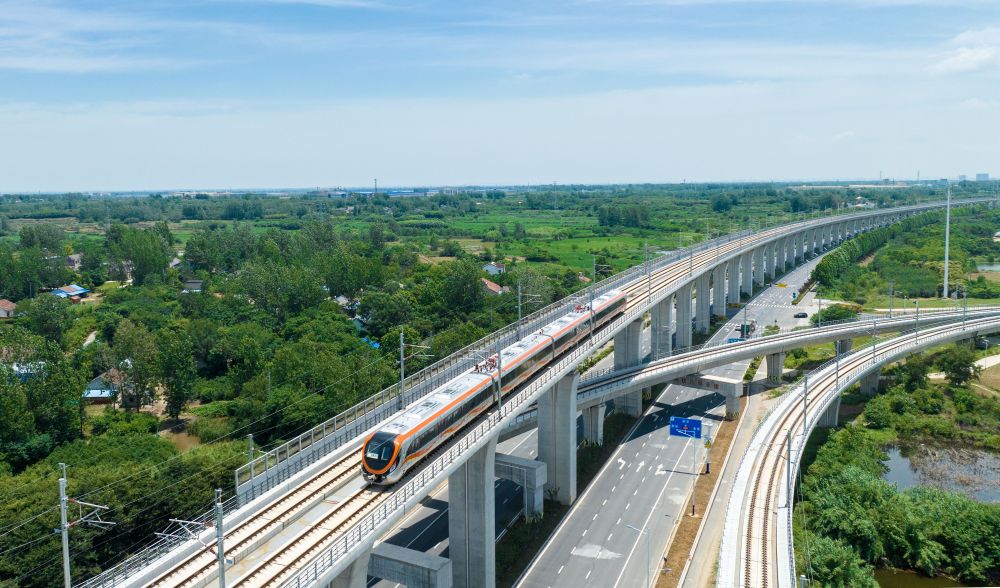 這是在滁州市拍攝的滁寧城際鐵路列車(2023年6月28日攝,無人機照片)。新華社記者 劉軍喜 攝