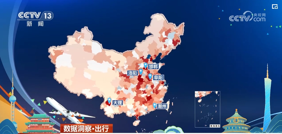 代表旅客凈流入的紅色占據(jù)了絕大多數(shù),達到城市總數(shù)的八成,甚至比4月30日還高了一成。在這些城市當中,洛陽、潮州、大理、阜陽、邯鄲等城市成為旅客凈流入量較大的目的地,這意味著在假期第一天,有更多人從中心城市前往了中小城市。