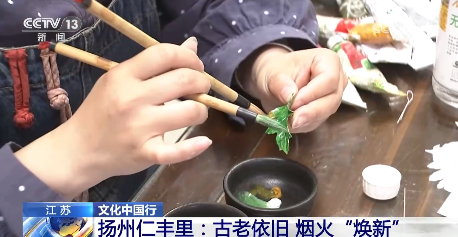 總臺(tái)央視記者 楊威:將傳統(tǒng)的非遺技能進(jìn)行適合現(xiàn)代生活的活化式展現(xiàn),是仁豐里非遺呈現(xiàn)的一大特色。像作為江蘇省級(jí)非遺的揚(yáng)州通草花制作技藝,已經(jīng)有了超過兩千年的歷史,以前只是專攻于宮廷,如今在這里您可以近距離地觀賞手藝人們現(xiàn)場(chǎng)制作的技巧,也可以親自上手做一個(gè)屬于自己的通草花帶回家。