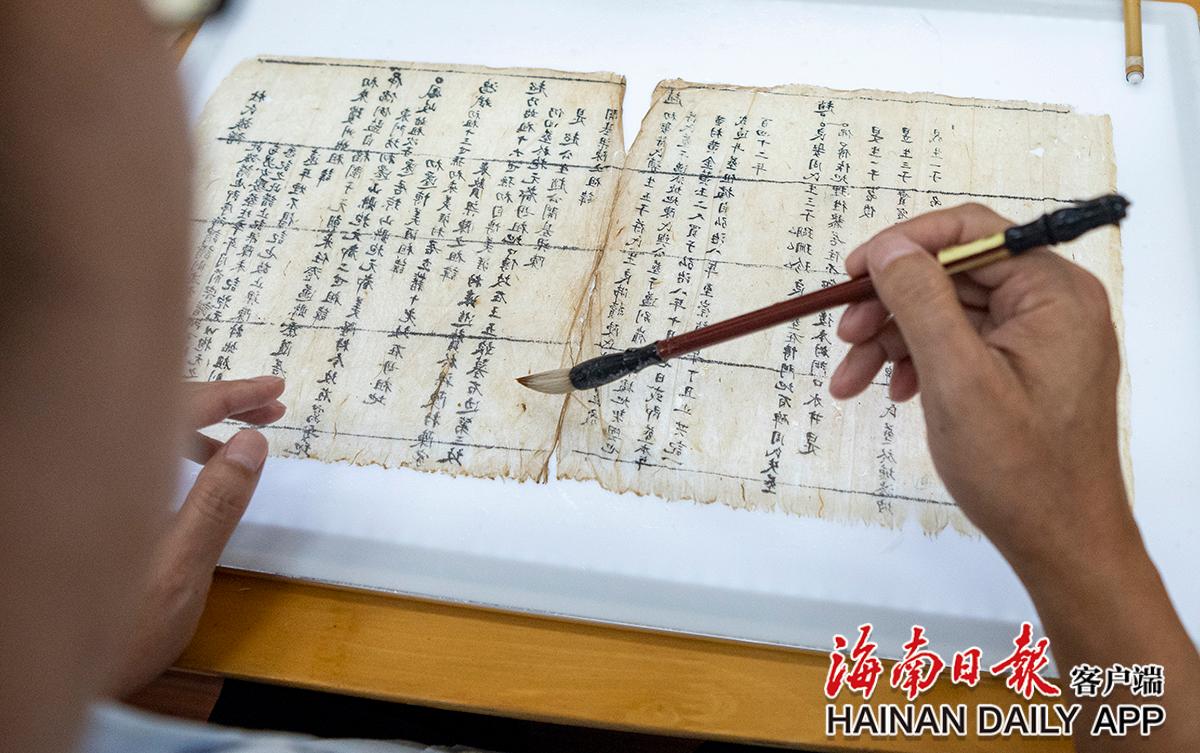 黃文鋒將修復(fù)后的古籍書頁,粘貼、加固到新紙上。海南日?qǐng)?bào)記者袁琛 攝