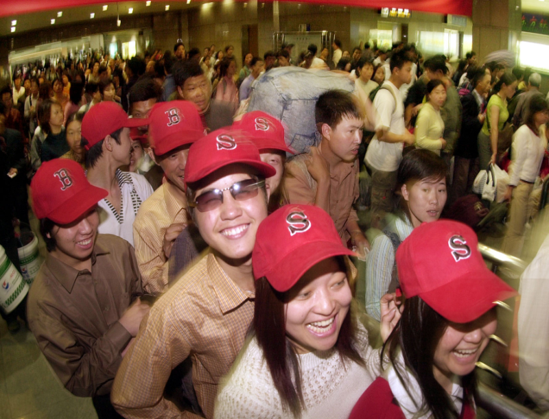 2004年5月1日,在杭州火車站出口處,大批旅行團(tuán)游客準(zhǔn)備出站?!拔逡弧逼陂g,來自全國各地的大批游人通過鐵路和公路涌入杭州,形成旅游高峰。新華社發(fā)(李震宇 攝)