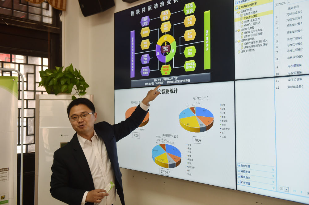 “漁博士”沈杰在浙江省湖州市菱湖鎮(zhèn)創(chuàng)辦的公司內(nèi)介紹匯集養(yǎng)殖戶、飼料廠商、銷售檔口、金融機(jī)構(gòu)等相關(guān)方的物聯(lián)網(wǎng)平臺(資料照片)。