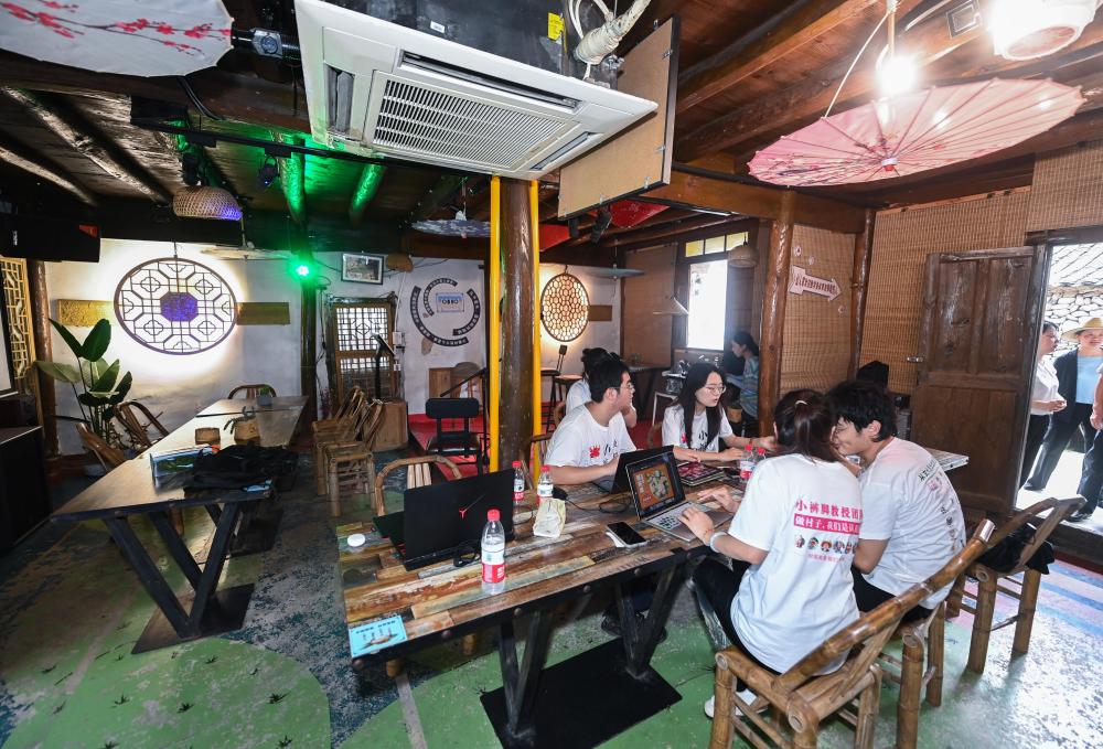 2023年8月11日,高校藝術(shù)院系的大學(xué)生們在寧波市寧??h葛家村的特色酒吧內(nèi)討論村落藝術(shù)改造提升的設(shè)計(jì)方案。 新華社記者 徐昱 攝