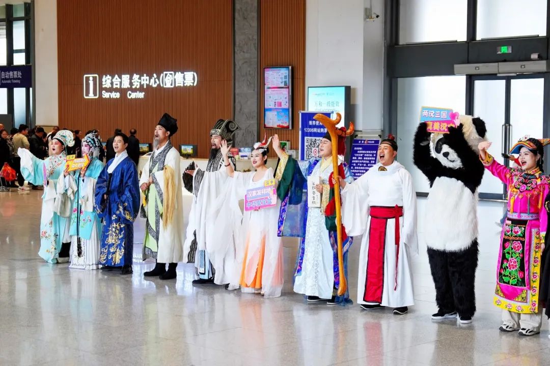 西安局集團公司與地方文旅局對接,組織張騫、劉邦、蔡倫等歷史文化名人及秦嶺四寶人偶、非遺漢調(diào)桄桄戲和羌族服飾演員組成的文旅IP在漢中站開展特色迎賓活動,在互動中引導(dǎo)旅客文明出行,展示地域文化。