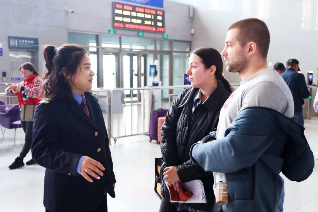 綏芬河站更是在國際聯(lián)運的一線發(fā)揮著不可或缺的作用。哈爾濱局集團公司針對假期綏芬河口岸外籍跨境游旅客增多的實際,組織翻譯員工成立志愿服務(wù)小隊,為外國旅客提供雙語服務(wù)。