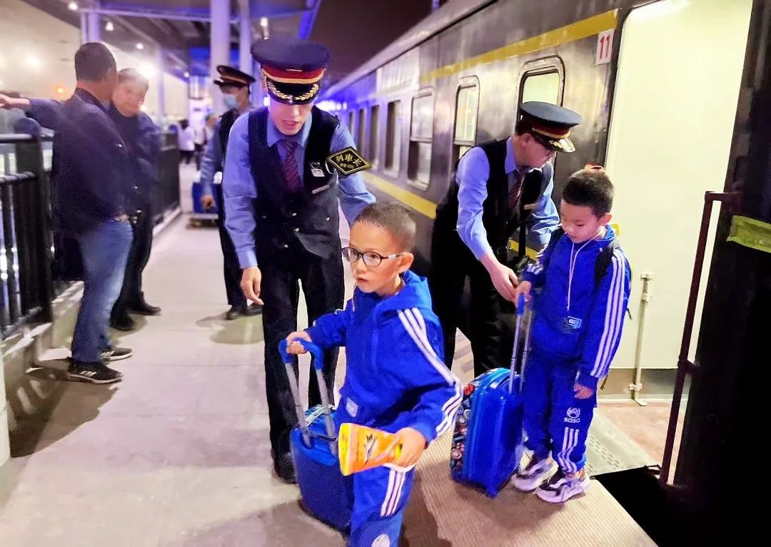 在吐魯番站,一群可愛的小學(xué)生在老師們的帶領(lǐng)下有序登上7557次列車,列車長蔣耀和乘務(wù)員西爾扎提·居來提在11號車廂門口幫孩子們把藍色行李箱提上車。