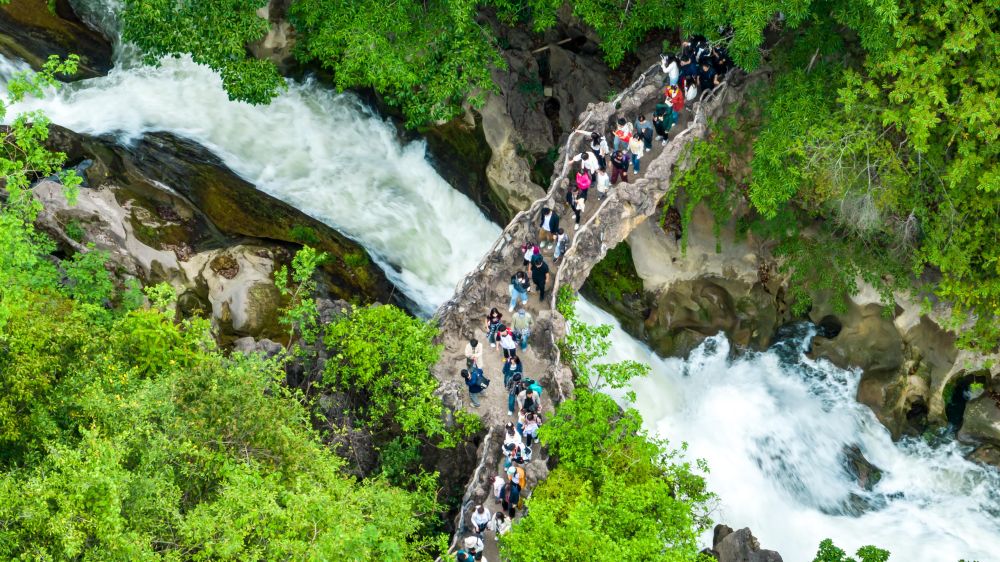 5月2日,游客在貴州省安順市天星橋景區(qū)游覽(無人機照片)。新華社發(fā)(陳熙 攝)