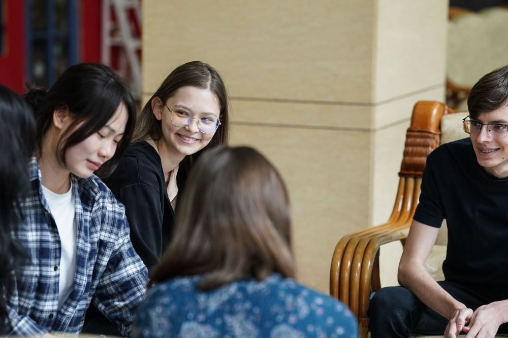 宋智孝(左二)在北京首都師范大學(xué)校園內(nèi)與同學(xué)交流(2024年4月28日攝)。