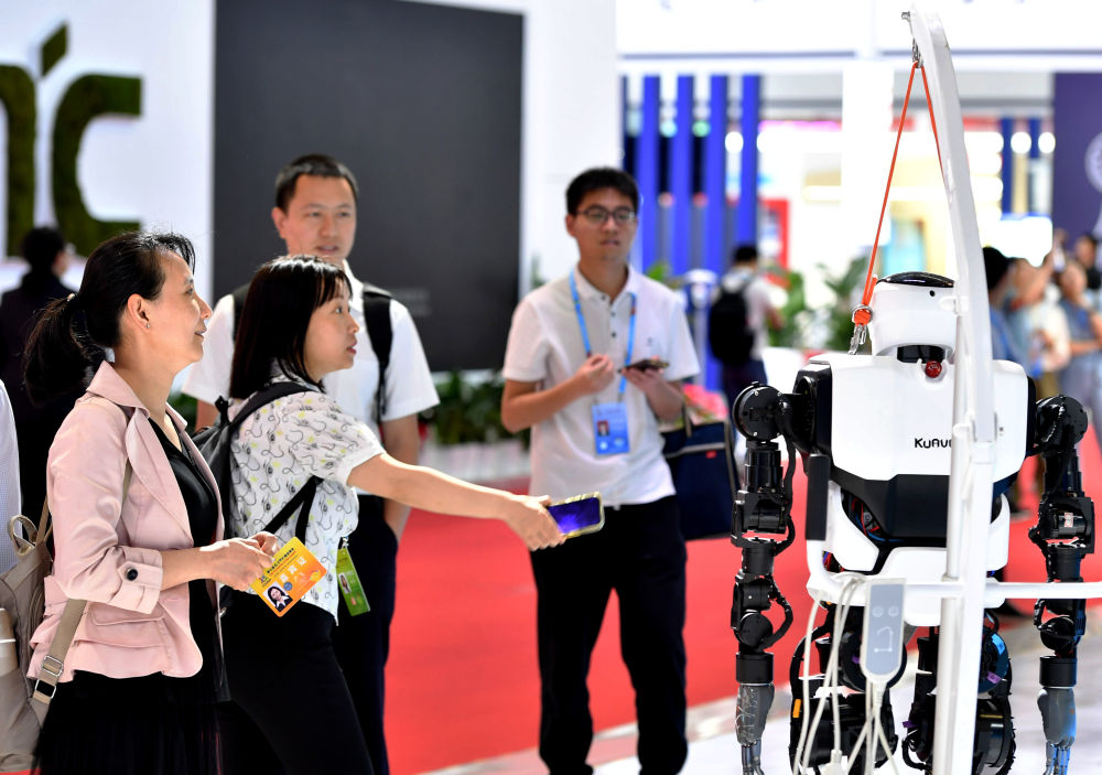 5月24日,在第七屆數(shù)字中國(guó)建設(shè)峰會(huì)現(xiàn)場(chǎng)體驗(yàn)區(qū),觀眾在觀看“移動(dòng)愛家機(jī)器人”。新華社記者魏培全攝
