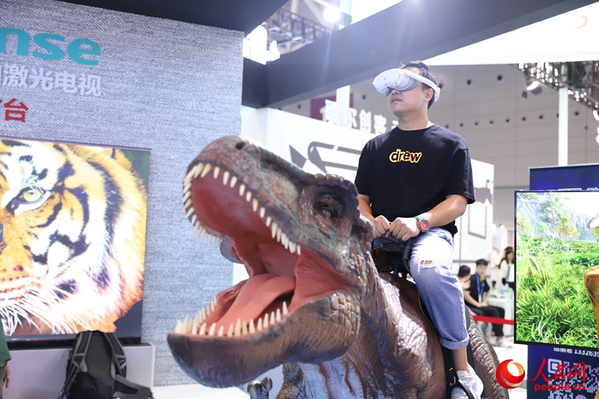戴上VR設(shè)備,進入“侏羅紀(jì)時代”。人民網(wǎng) 劉森君攝