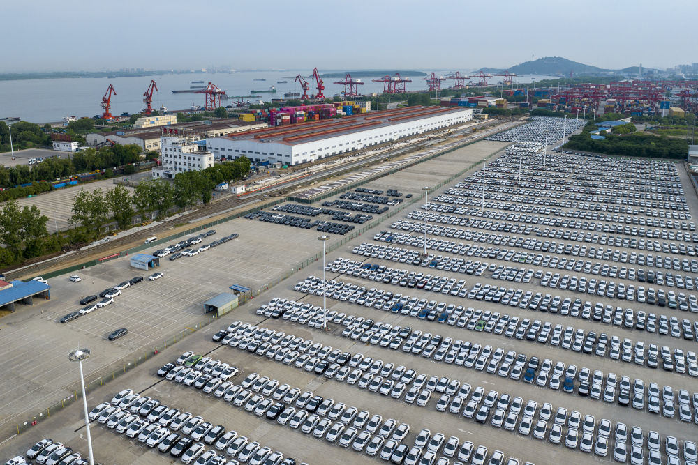 5月26日,在安徽蕪湖港朱家橋港區(qū)國(guó)際集裝箱碼頭,整齊排列的汽車(chē)等待出口(無(wú)人機(jī)照片)。 新華社發(fā)(肖本祥 攝)
