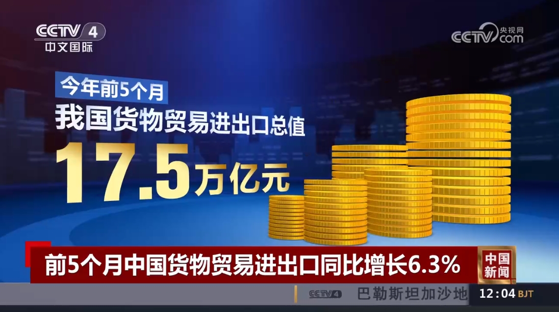 據(jù)海關(guān)統(tǒng)計(jì),今年前5個(gè)月,我國貨物貿(mào)易進(jìn)出口總值17.5萬億元,同比增長6.3%。其中,出口9.95萬億元,增長6.1%;進(jìn)口7.55萬億元,增長6.4%。5月當(dāng)月,進(jìn)出口3.71萬億元,同比增長8.6%。其中,出口2.15萬億元,增長11.2%;進(jìn)口1.56萬億元,增長5.2%。