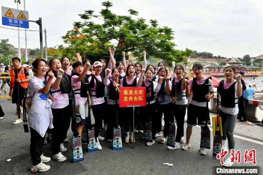海峽兩岸龍舟賽在廈門(mén)集美上演。圖為集美大學(xué)龍舟女隊(duì)參加比賽。中新社記者 呂明 攝