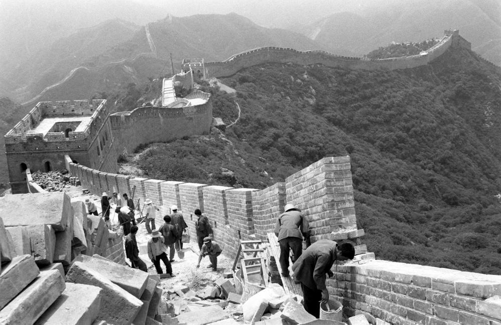 工人正在修復北京八達嶺長城的一段城墻。這是用由北京晚報、八達嶺特區(qū)辦事處等單位聯(lián)合發(fā)起“愛我中華 修我長城”社會贊助活動所獲款項進行修復的第一期工程 (資料照片,1984年8月11日發(fā))。新華社記者 袁汝遜 攝