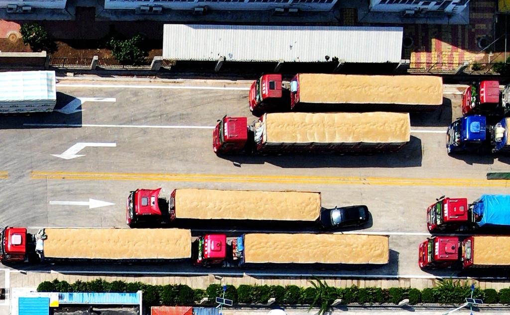6月15日,在山東省臨沂市平邑縣一處糧食儲備庫夏糧收購現(xiàn)場,運輸車輛排隊售糧(無人機照片)。新華社發(fā)(武紀全 攝)